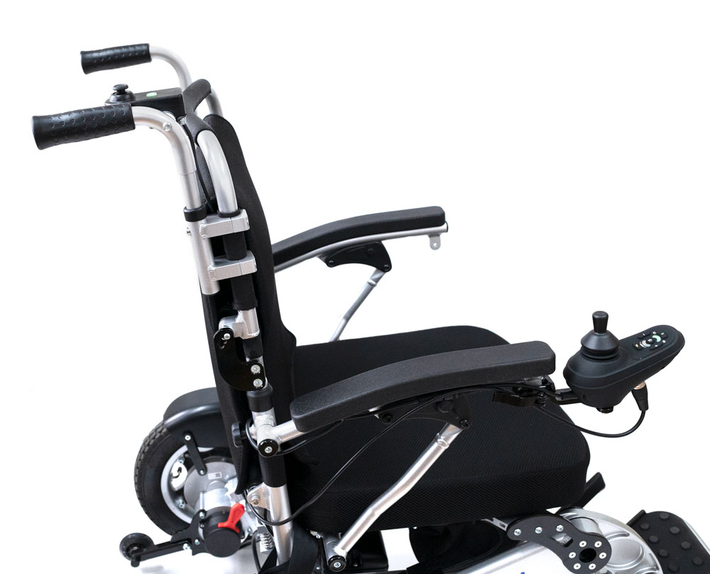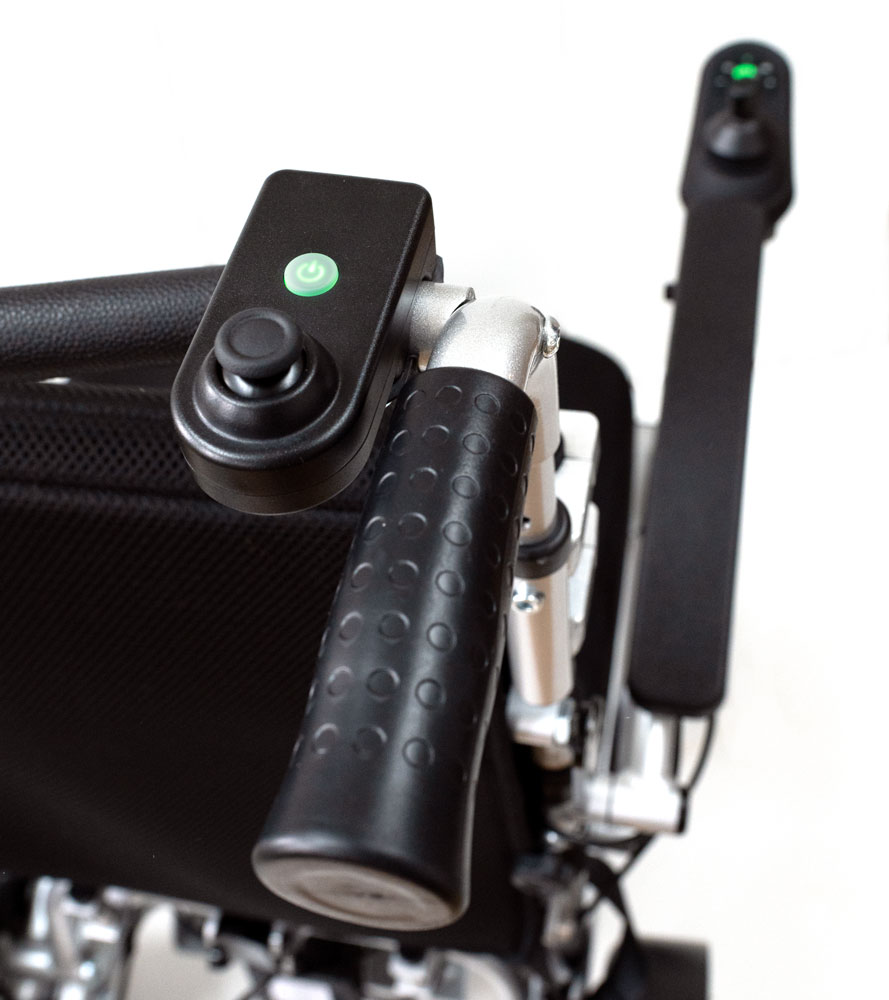 Er du venstre- eller højrehåndet? Det er ikke noget problem. Du kan selv vælge, om hjælper styringen skal placeres i højre eller venstre side. Det tommelfinger styrede joystik får strøm fra el-kørestolens almindelige batterier og kontrolboks, så det ikke er nødvendigt at oplade det. Det bruger heller ikke mere batteri, så din Eloflex bevarer den lange rækkevidde. Den samlede vægt af hjælper styringen, inklusive joysticket, er 1,5 kg. Eloflex