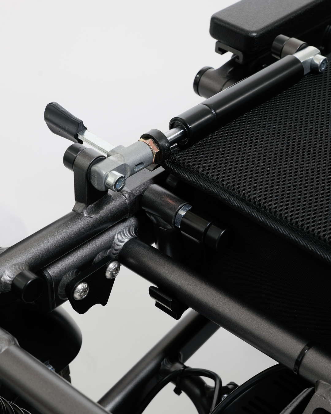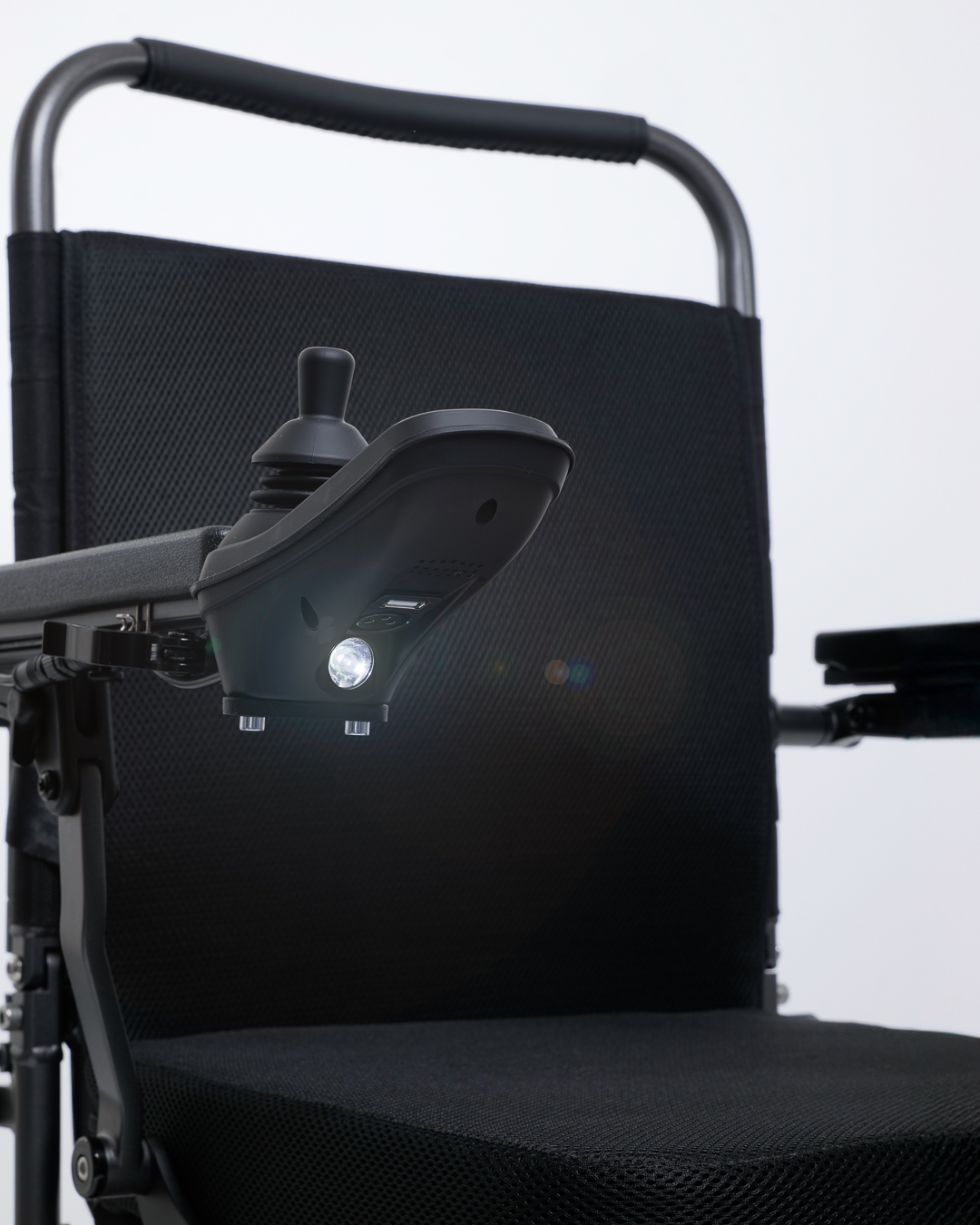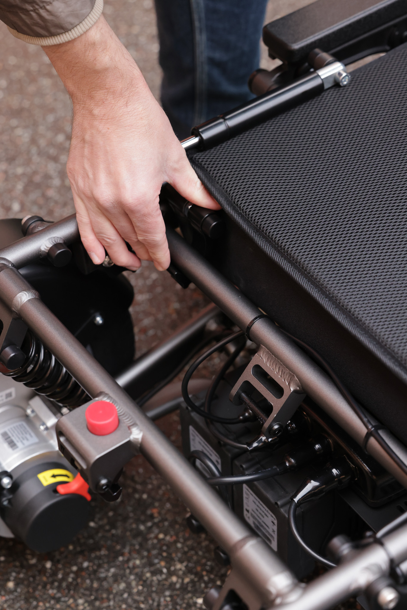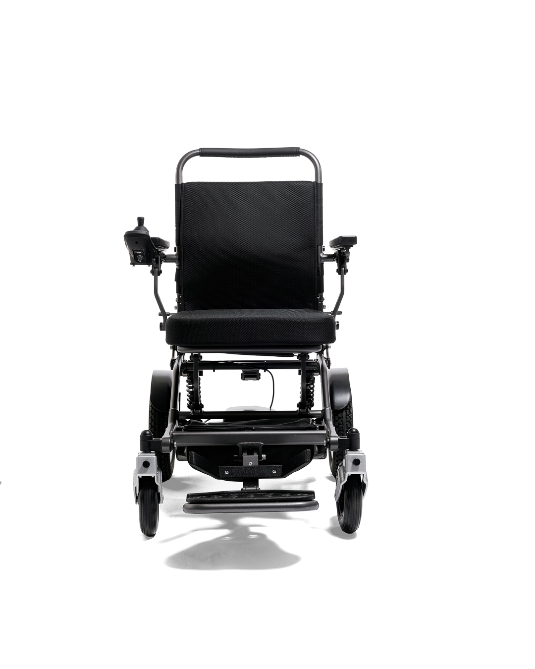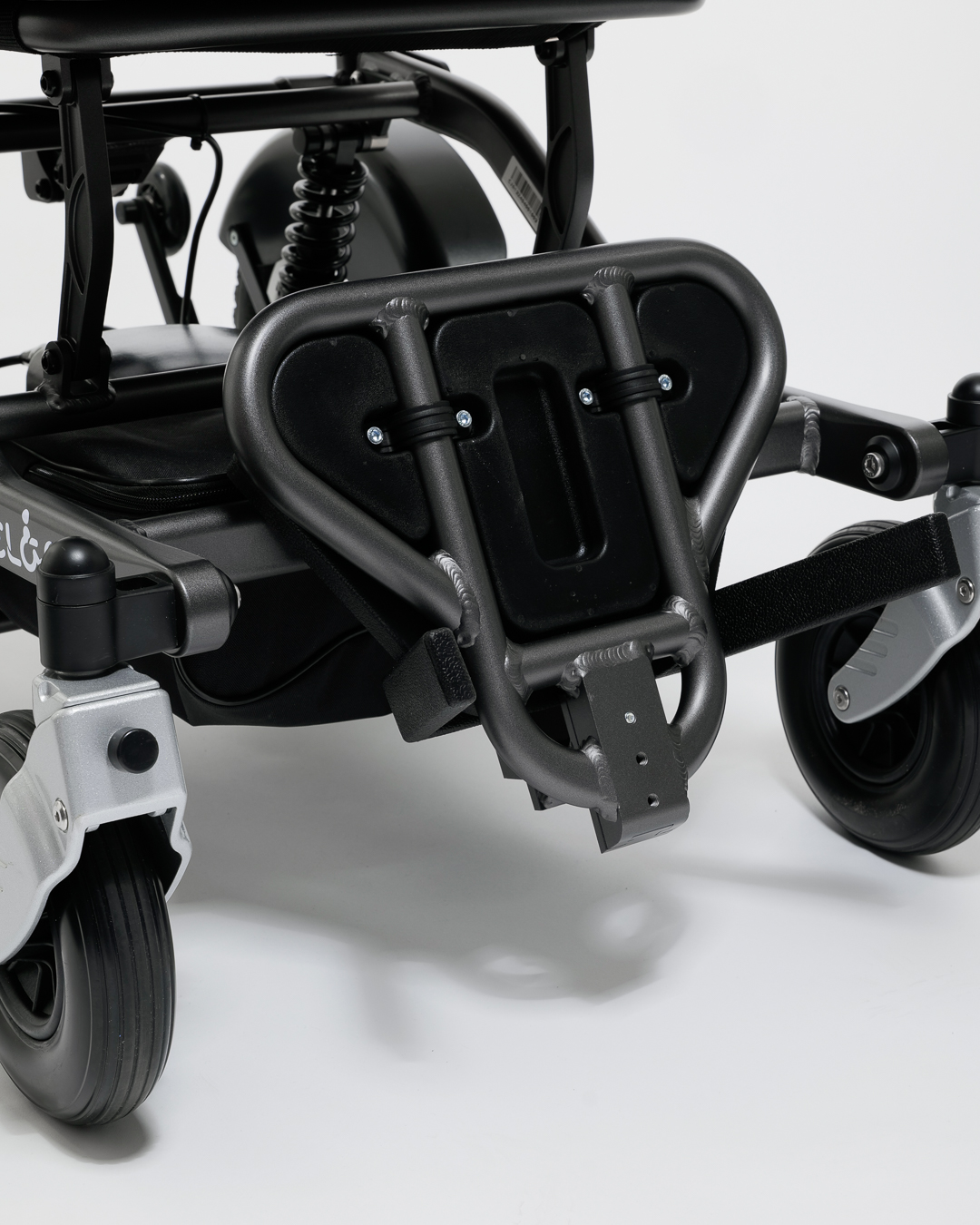 Justerbare armlæn og fodstøtter giver en mere skræddersyet pasform og understøtter modellens fokus på komfort. Med tre batteriopbevaringspladser tilbyder denne model udvidet brugstid til længere ture. Når den er sammenfoldet, holder en praktisk sikkerhedslås rullestolen låst i sammenfoldet position for nem transport og opbevaring.