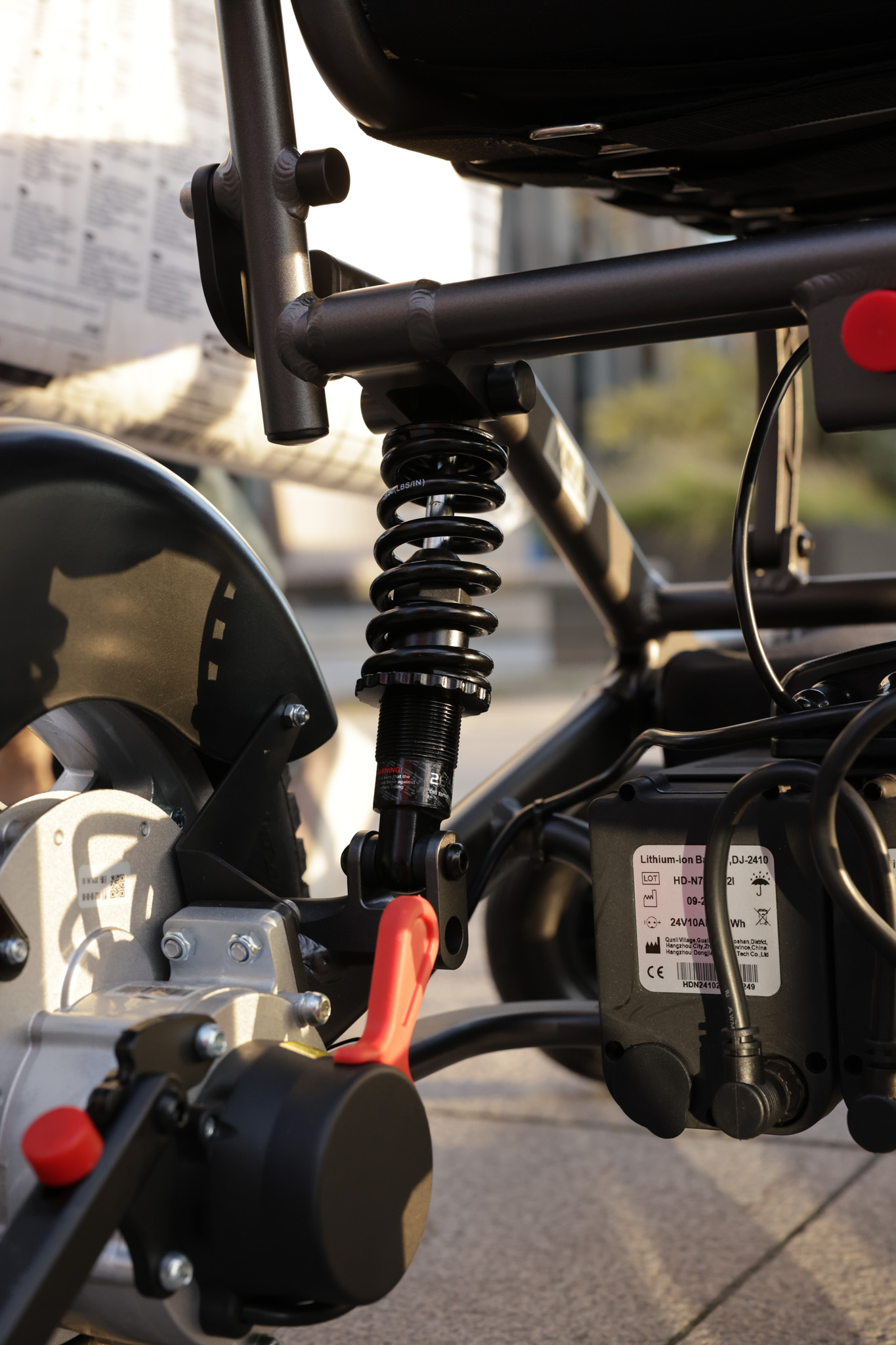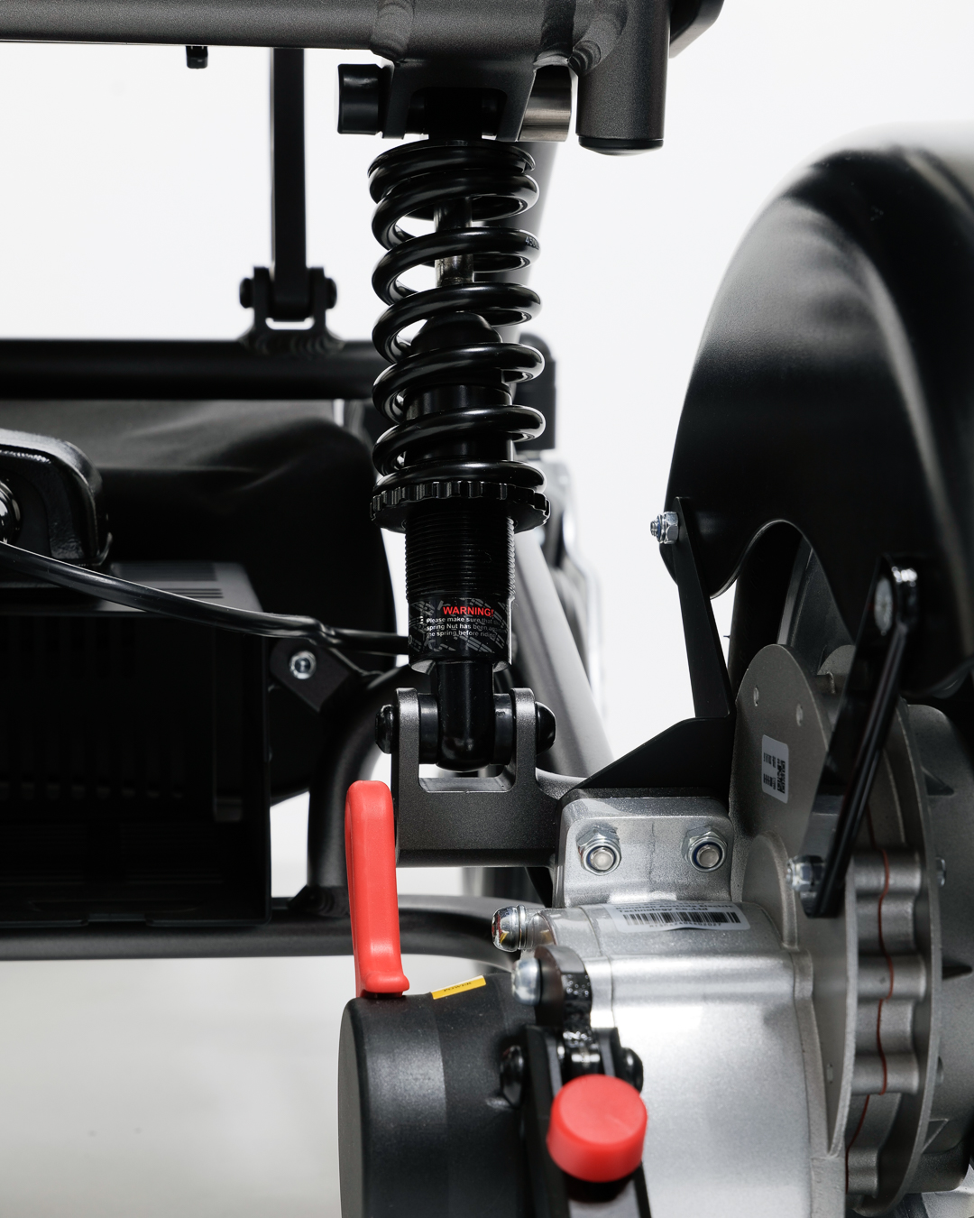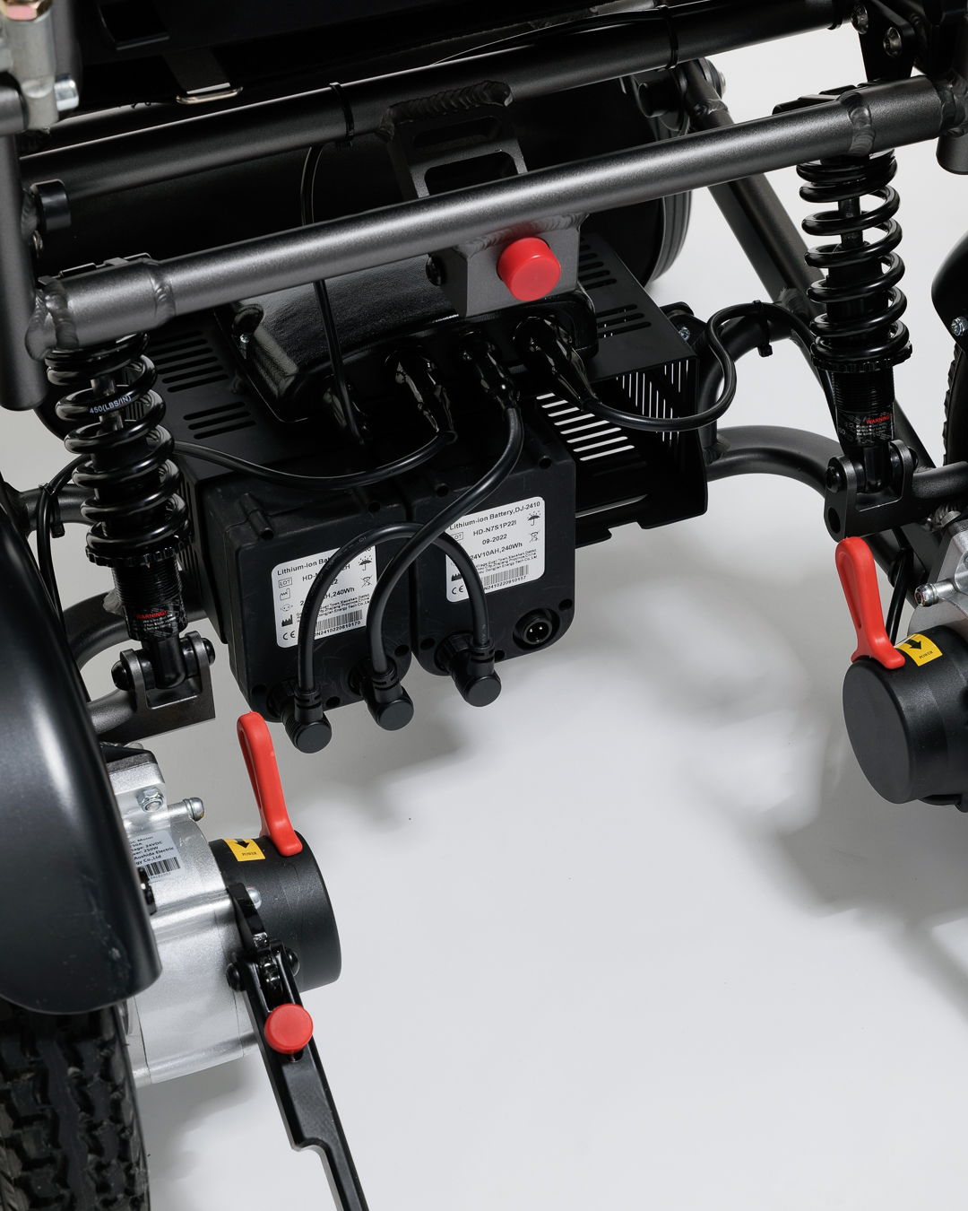 Med affjedring på alle fire hjul og effektiv dæmpning på baghjulene sikrer denne stol en jævn og behagelig kørsel. Køreegenskaberne forbedres yderligere af det specialdesignede stive og robuste chassis.