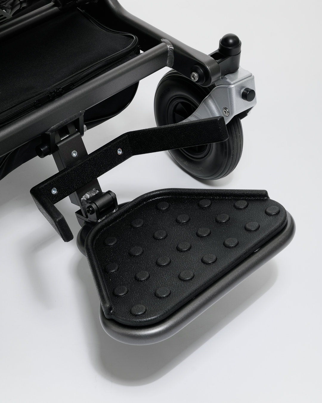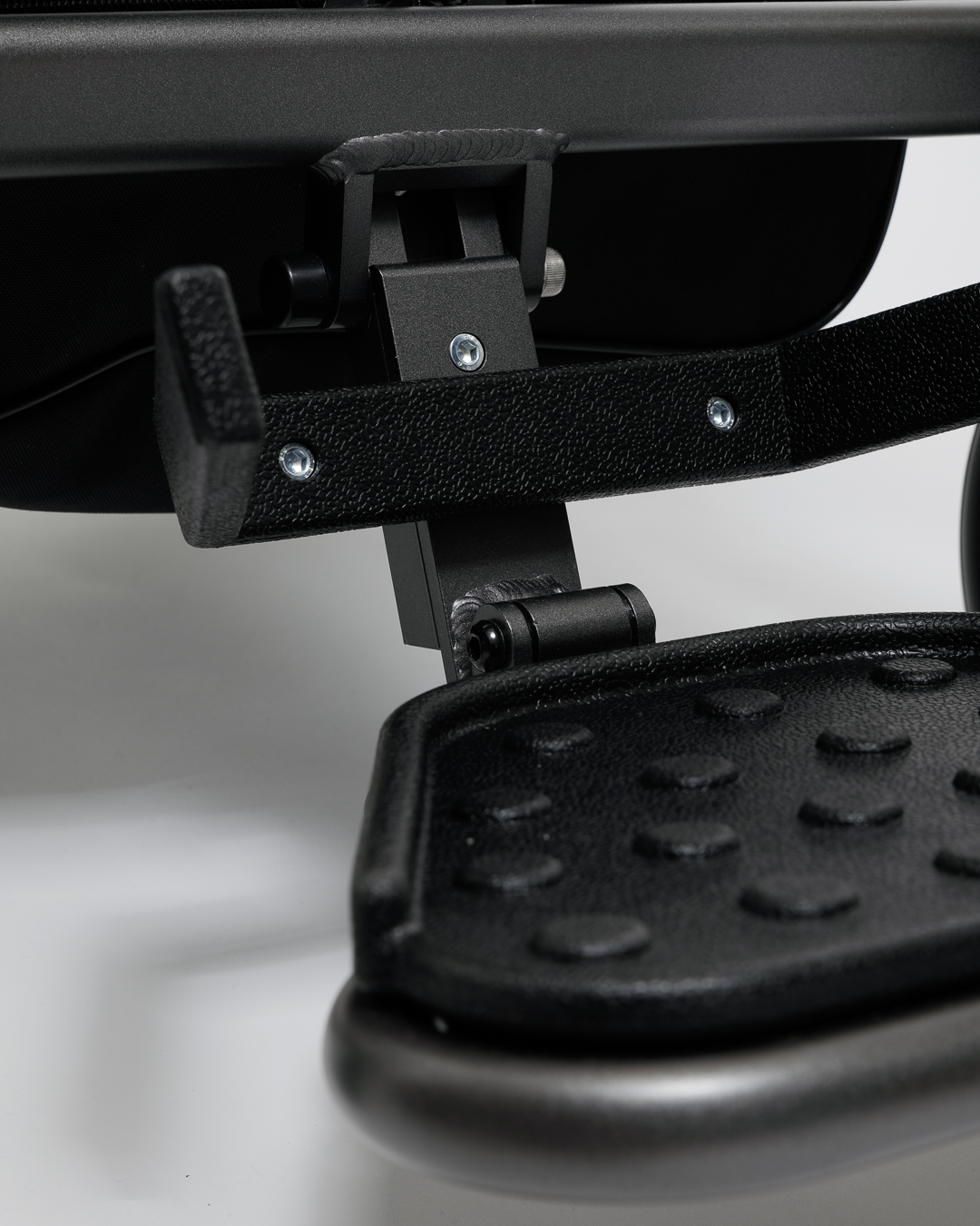 Denne model har en smart fodstøtte, der kan justeres både vertikalt og horisontalt, hvilket sikrer maksimal komfort. Designet for bekvemmelighed, kan fodstøtten let foldes væk, hvilket gør det nemt at komme ind og ud af stolen.