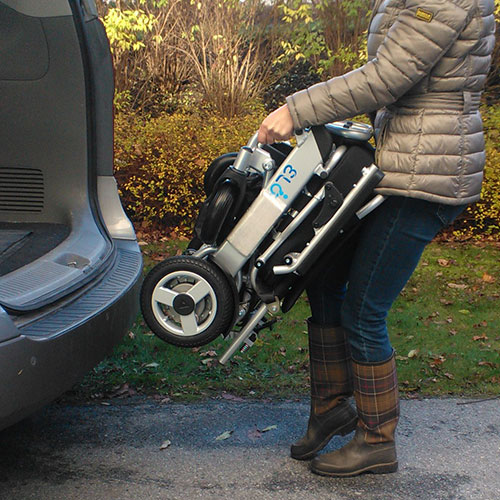 En metode med et lavere greb til lavere personer. Med denne metode kan du bruge hjulene til at rulle stolen ind i bilens bagagerum. Sørg for at frakoble motorerne, før du løfter den.